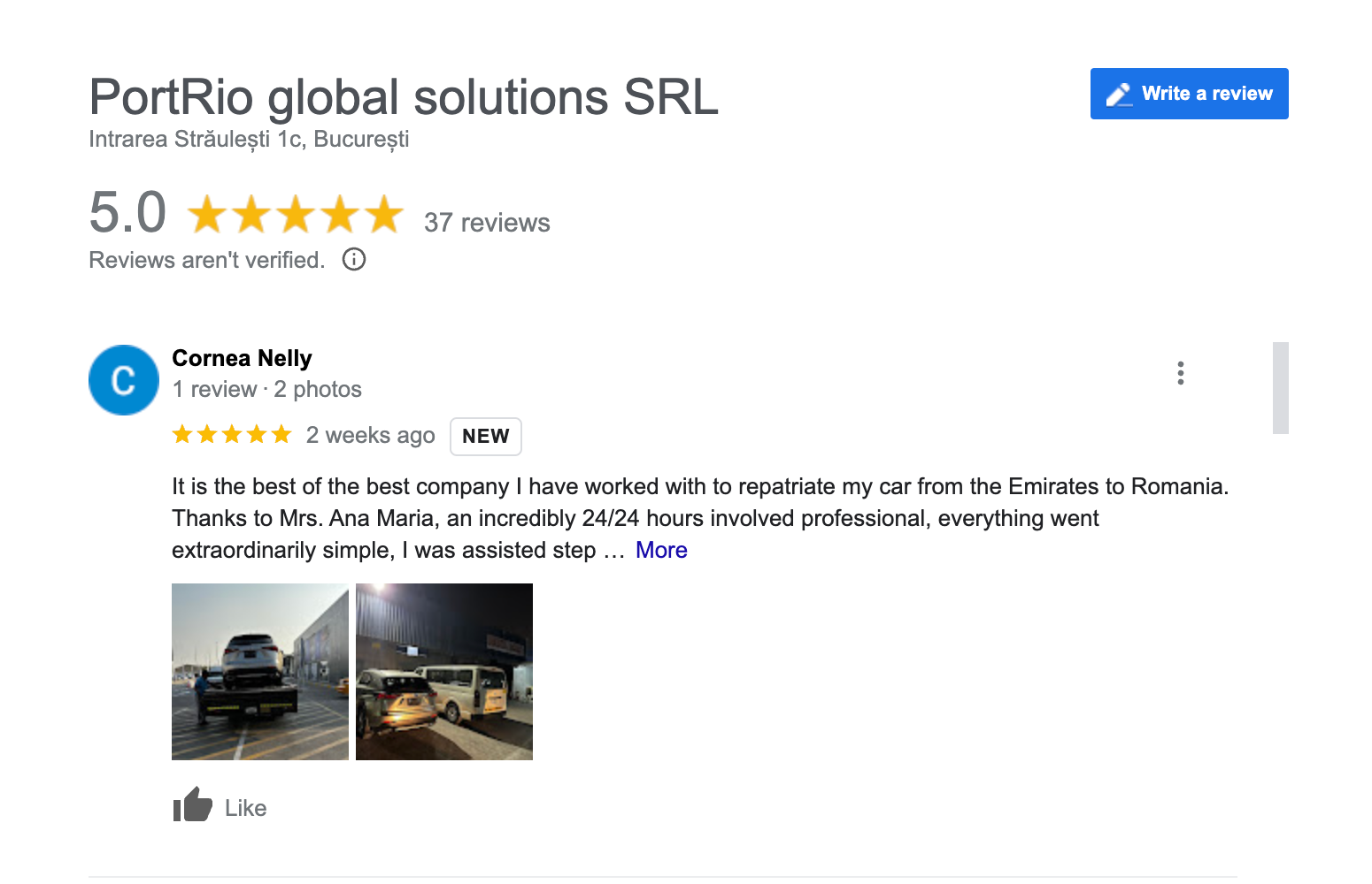 It is the best of the best company I have worked with to repatriate my car from the Emirates to Romania. Thanks to Mrs. Ana Maria, an incredibly 24/24 hours involved professional, everything went extraordinarily simple, I was assisted step by step in all the transport formalities, filling out the documents, electronic applications, customs notices, so that everything went normally and without the slightest problem, something you rarely find in companies in this field!